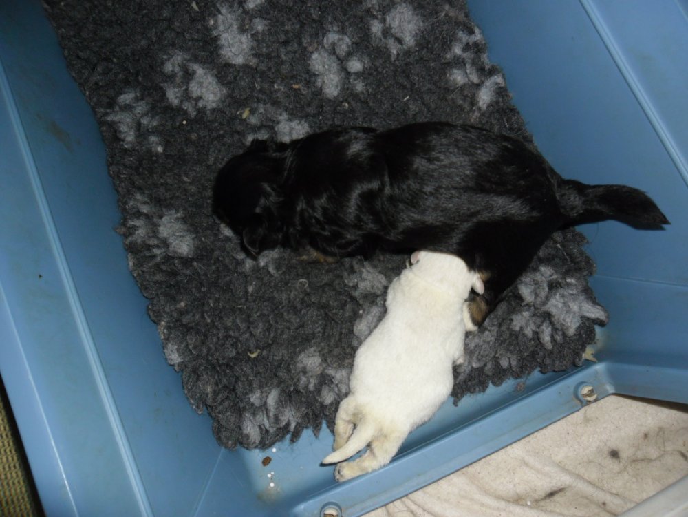 Så må jeg vel hellere komme med en update.. Det har fandmer været hårdt!!! Måske jeg er for gammel til det her hvalpegøj med op- og nedture??? neeeejjjj umuligt er jo kun 22 Men sidst jeg skrev sondede jeg jo dem alle 3... Det gik faktisk rigtig rigtig fint.. Indtil 3 dag hvor sondemadede altid får en krise.. De stoppede med at tage på.. "spiste" fint, men havde ikke taget på til næste gang de skulle have mad.... Dyrlægen kom forbi og syntes at alt umiddelbart så fint ud..Bortset fra at de ikke tog på... Vi havde hele tiden(døgnet rundt) måtte tjekke alle om de tissede osv.. Molly gik fra en til 4 hvalpe og glemte ind i mellem en numse... Men nu trådte Terry pludselig til..Og de blev væltet rundt og holdt rene til den stor guldmedalje.. Og suttede sig fast på hende..Så nu havde de pludselig 2 mødre..En med en god tunge og en med nogle gode patter... Men så pludselig gik det ned af bakke for den lille dreng og i løbet af et par timer døde han.. Fat i dyrlægen igen.. Som gav dem et lillebitte skud penicillin (måske var tyndskid grunden til at de ikke tog på).. Vi lagde væske et par gange for en sikkerheds skyld. Og fandt pludselig på begge piger nogle små bumser i lysken.. Der var vi lige ved at gå i panik!!! for dyrlægen mente at det kunne være stafylokokker..Så hjem og hente den anden mor og den lille fede Romeo.. For det smitter! Men hverken mødrene eller Romeo havde nogen bumser... Og prøver viste heldigvis ingenting.. Så vi blev enige om at jeg nok havde været for hård med kluden da jeg stod for numsevaskningen... Den lille pige havde pebet stort set siden hun blev født..Og pludselig holdt hun op med at pibe.. Vi blev så glade! Men så pludselig blev hun tiltagende dårlig.. Og da dyrlægen (endnu engang) kom forbi blev hun aflivet.. Den store pige så fin ud, men tog stadig ikke på Dorte (opdrætteren) og jeg snakkede sammen...Hvor længe skulle vi blive ved? Dyrlægen synes hun så fin ud... Hun synes faktisk jeg så meget værre ud end hvalpen På det tidspunkt var jeg faktisk også rimelig brugt.. Sov omkring 1½ time i døgnet, men aldrig sammenhængende.. Faldt i søvn når jeg lænede mig op af væggen eller sad stille.. Vi havde nu haft hvalpene i en uge og den store pige som var tilbage, startede på 200 gram da hun blev født, tabte sig til 110 gram..og var nu oppe på 150 gram..og stod stille.. Torsdag aften blev Dorte og jeg enige om at hun fik til søndag..Var hun ikke begyndt at tage på ville vi sige farvel til hende.. Det var dødsørgeligt. Man knytter sig jo alligevel til de små møgkræ, også selvom hun slet ikke lignede en løvebaby Torsdag nat blev den værste nat ever... Hun vågnede hver ½ time og hylede og virkede hamrende sulten.. Og værgrede sig mod sonden..og man kan bare ikke lægge en sonde på en der piber, så åbner luftrøret sig jo i stedet for, og sonden ryger forkert.. Pludselig opdagede vi at hun suttede sig fast på Terry og var meget ihærdig... Så vi byttede rundt og Mollys bedste patter blev fundet frem. Romeo blev smidt på en elendig patte og så suttede han gang i mælken og Wilma (som hun nu hedder) suttede og suttede og suttede.. Hun aste og maste og faldt så af patten og lå med maven lige i vejret og sov.. Vi bar hende ud og vejede hende..Regnede med hun havde fået 4-5 gram, men hun havde sq ædt 14 gram Så fra fredag morgen er det gået stærkt.. Hun vejede 150 g torsdag aften..I dag vejer hun knap 300 gram... Hun kravler rundt alle steder..Så snart Romeo flytter sig er hun lige i hælene på ham.. Og ja Romeo hopper ud af hullet i weekendsengen, og Wilma kommer efter..Og i dag hoppede hun op i Mollys madskål og begyndte at spise opblødt starterfoder... Selvom hun stadig ingen øjne har fået.. Men det ønsker hun sig Så det regne vi med at skaffe hende snart Jeg smider lige nogle billeder op af hende..