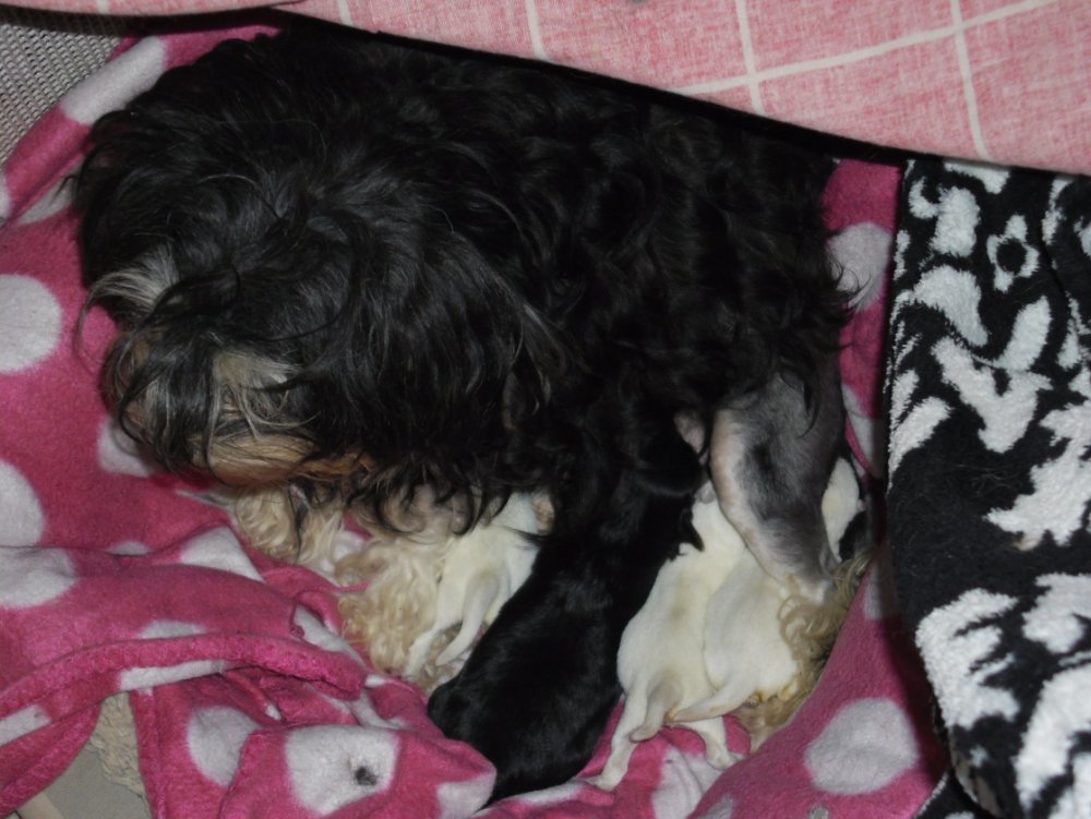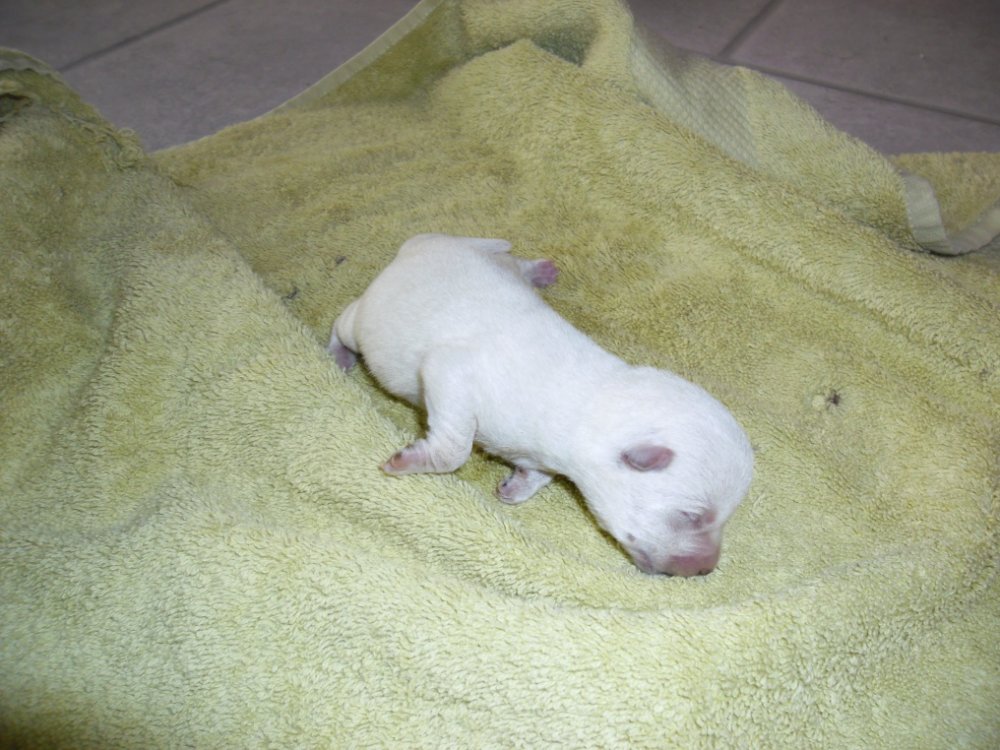 Den 9 november fødte Molly en hvalp... Da der kun kom den ene kontaktede jeg Kirsten fra Ammestuen. Måske der var et par hvalpe derude der manglede en mor? Kirsten ville lægge oplsningerne på sin hjemmeside..Og fjerne dem igår, da hvalpen ville være en uge der.. Igår eftermiddag/aften skulle vi på skolen til noget arrangement som Natascha og jeg var med til at arrangere. Jeg slukkede derfor min tlf, for hvalpekunder har en mani med at ringe når jeg ikk har tid Kl 20 tændte jeg den igen..og med det samme ringede Freudika og spurgte med panik i stemmen "Har du små hvalpe nu"..Jow det havde jeg da..En på en uge.. Ja for hendes veninde havde fået 3 westiehvalpe i mandags..og morhunden ville ikke have dem. De havde tabt sig meget og havde brug for en mor NU... Frudika gav mit nummer videre til familien med westiebabyerne som ringede 5 minutter efter... Måtte de komme med dem? JA selvfølgelig... Dog endte det med vi aftalte at mødes hos noget af deres familie i Nørre Sundb, hvor vi kunne låne et værelse.. Grnden til det valg var at jeg ikke havde været hjemme i flere timer. Og hundene kommer helt op at køre og skal ud, kæles, springer rundt.. Og kommer der så samtidig gæster ville stressniveauet stige til uanede højder.. Med risiko for at Molly ville blive for stresset til at vi kunne få hende til at tage dem.. Vi mødtes i værelset og introducerede stille og roligt Molly for hvalpene.. Hun kiggede en smule..De var jo småbitte. Mollys hvalp vejer nu 400 gram..De vejede (på vores vægt) mellem 110-120 gram..Den mindste, en hanhund, fik en sjat sondemad inden han røg over til Molly.. Vi snakkede et par timer sammen (ingen af os kendte jo hinanden i forvejen). Så pakkede vi os sammen og tog hjem. Dorte og hendes mand skulle jo også hjem og sove. Det var 6 dage siden de havde sovet rigtigt. Vel hjemme fik alle tre en omgang sonde og så faldt de i søvn sammen med Molly og deres nye bror.. Den lille hanhund har så fået sonde hver 2 time.. Pigerne får hver anden gang han får.. og kun for lige at booste dem lidt.. Mellem sonderne sutter de fint, men ikke så kraftigt..Lidt får de dog indenbords, så jeg regner med pigerne snart kan klare sig selv.. Drengen bliver jeg med lidt længere. Han er en del svagere og får intet ud af patterne. Heller ikke når storebror har suttet.. Men indtil videre er vi fortrøstningsfulde. Alle har siden midnat taget 10-15 gram på.. Her kommer lidt billeder :slem: